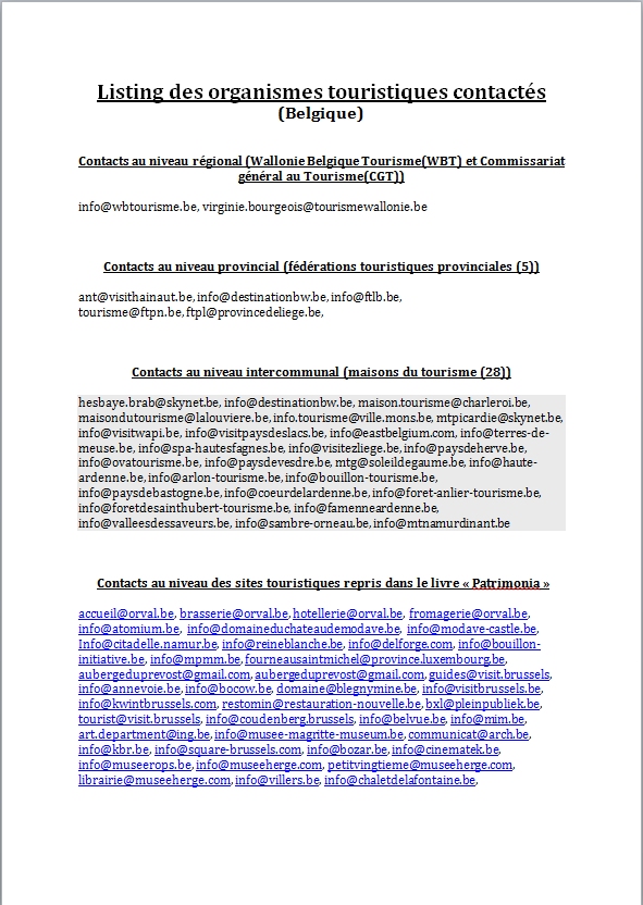envoi d'un email aux organismes du tourisme et aux sites touristiques des régions Wallonie-Bruxelles pour les informer de la publication des livres virtuels "Patrimonia" ainsi que des moyens permettant d'y accéder gratuitement. ( listing des organismes ) |